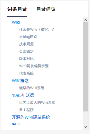 互動百科的目錄類似于文章中的段落標題,是組織詞條內容的重要工具。目錄還有索引的功能,瀏覽者通過點擊目錄可以快速到達并瀏覽該段內容。