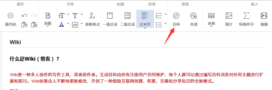 在詞條編輯頁面,用鼠標選中要添加內部鏈接的文字,然后點擊“內鏈”按鈕,文字上就會添加上內部鏈接。如下圖所示: